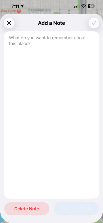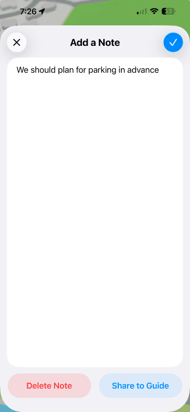 The user can add a personal note to a location, or choose to share it to a guide it is listed in