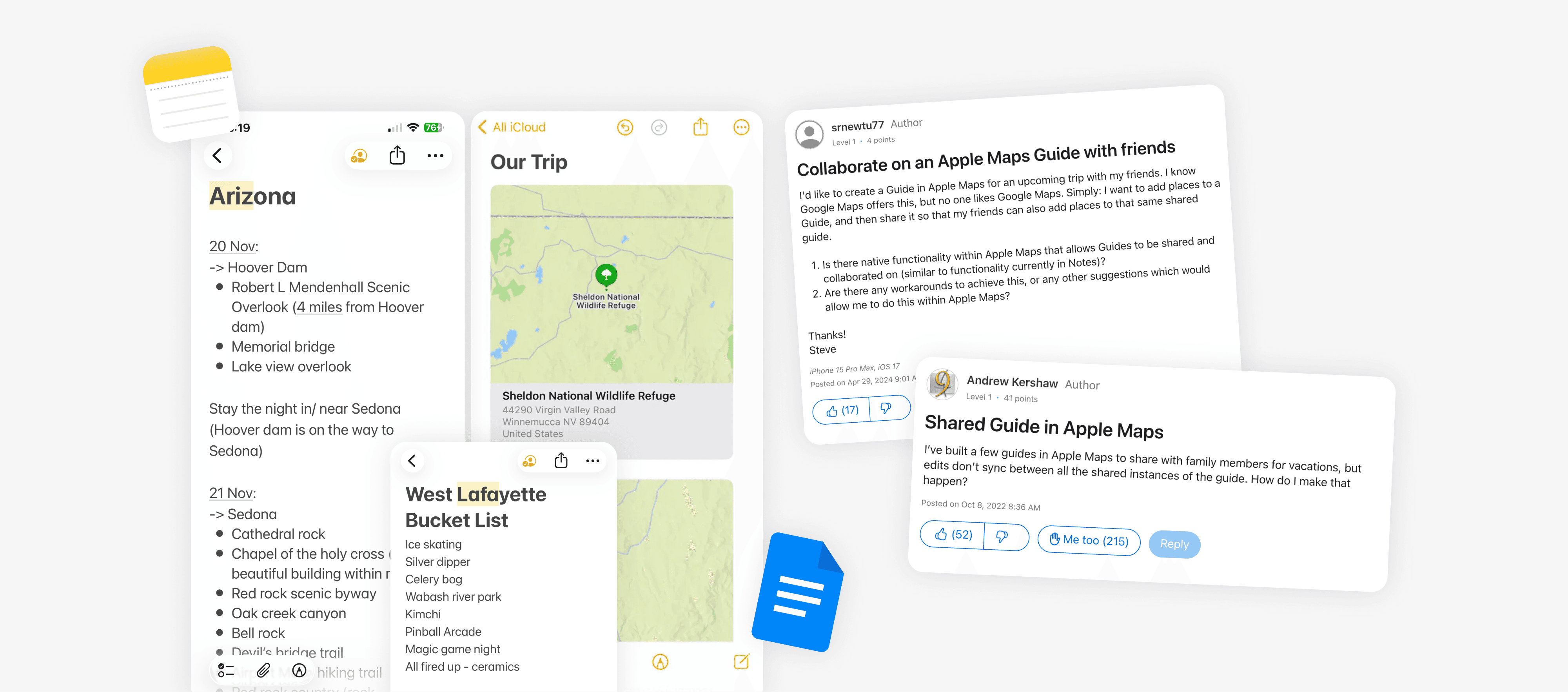 We would use collaborative notes on iOS or Google Docs, and write down places with any associated comments. In line with my own reflection, scouring through Reddit and the Apple Community Board showed me that many other users resort to similar solutions and have long been asking for a centralized sharing feature.