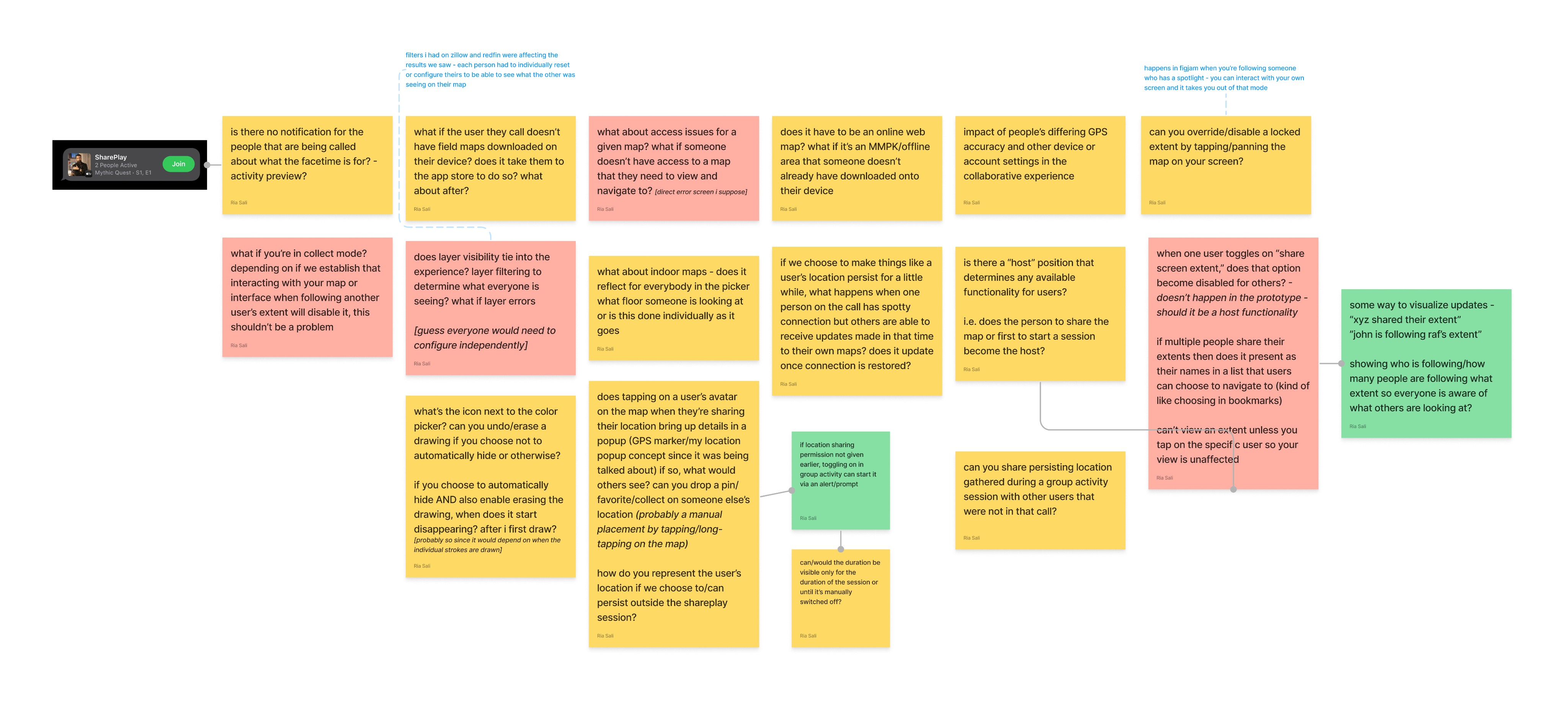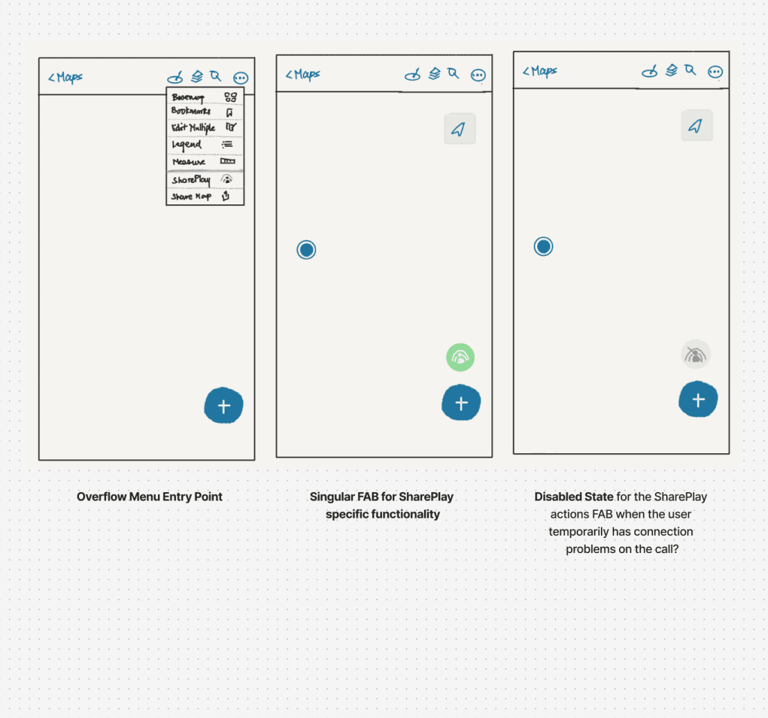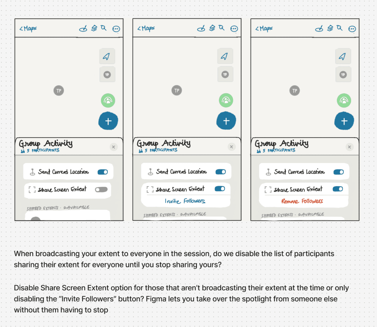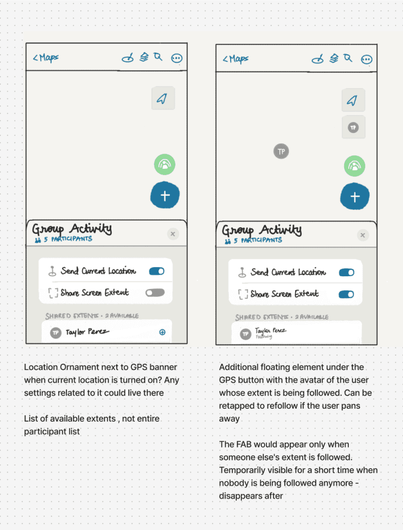 Sketching. Lots of it. We wanted to let users have the ability to share their location and the map extent they're zoomed to (which behaves similar to a Figma canvas) to others in the call and view the same to support remote collaboration.